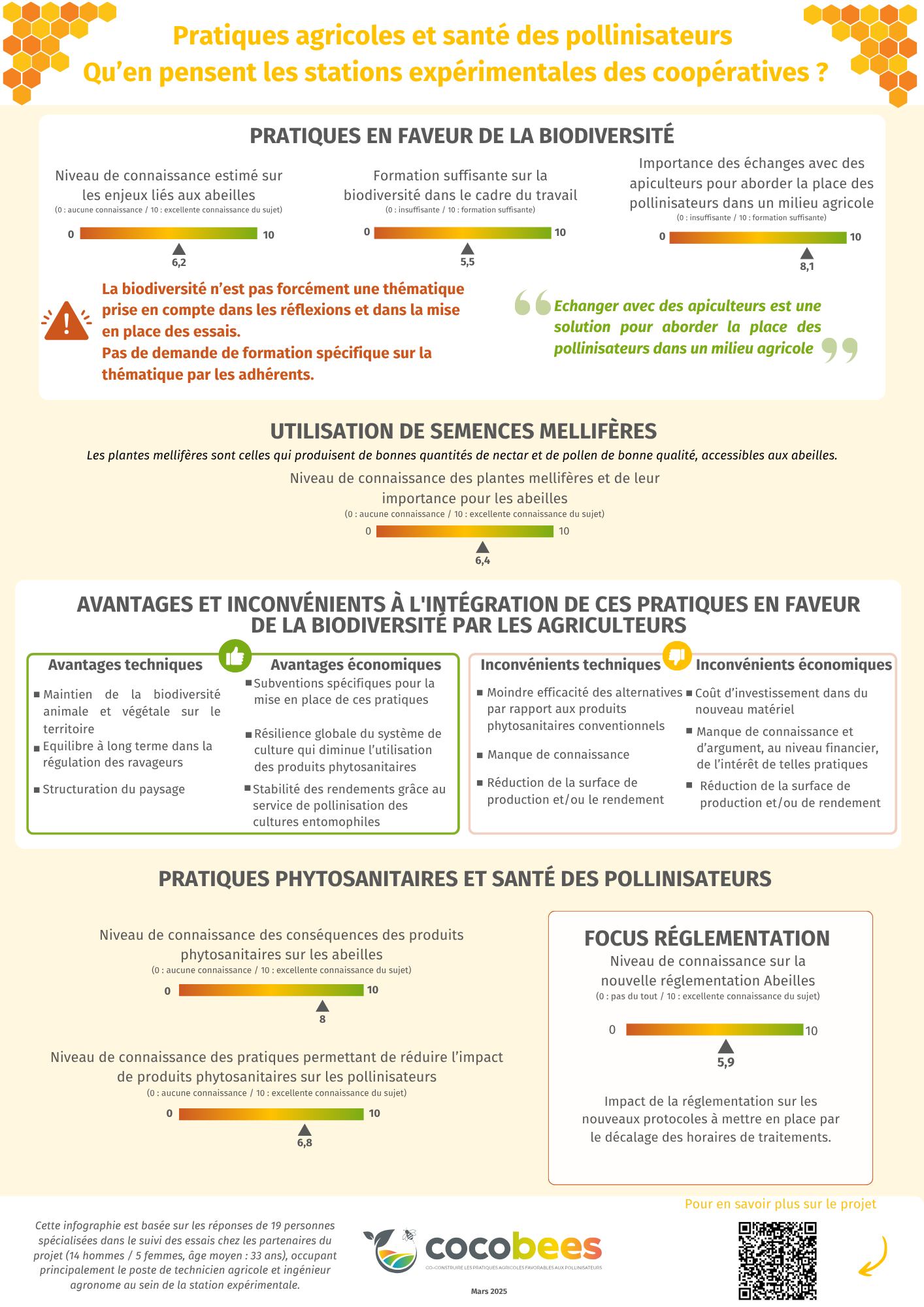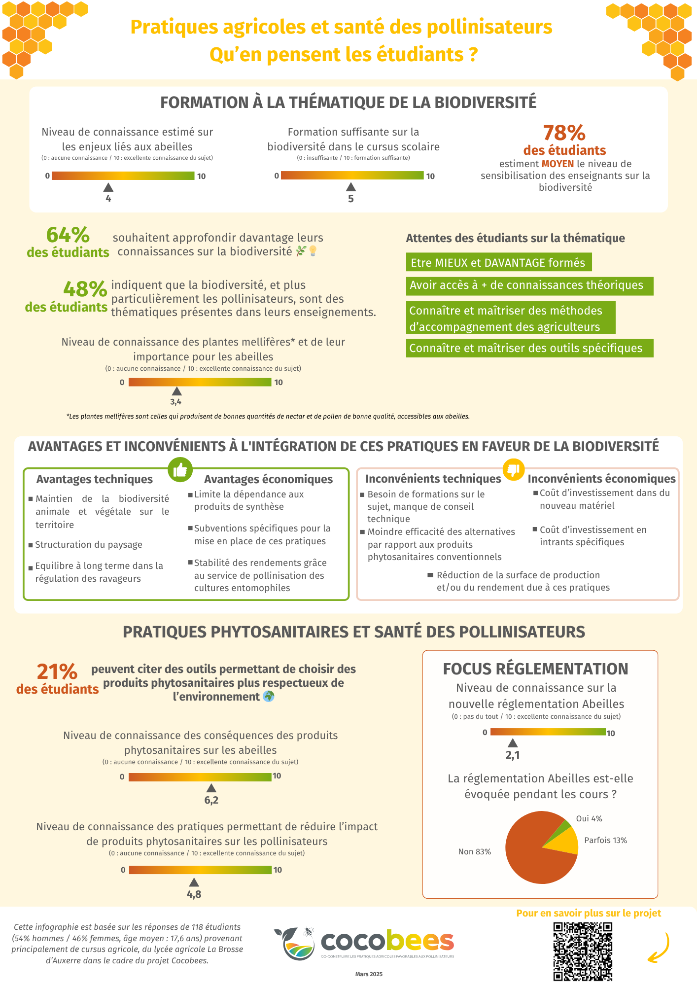 Nous avons commencé par recenser les pratiques et le niveau de sensibilisation des différents acteurs impliqués. Un questionnaire a été diffusé auprès des agriculteurs et des conseillers de coopératives, tandis qu'un autre a été créé pour les élèves et les professeurs du lycée partenaire. Des infographies ont été réalisées pour illustrer ces données : Infographies cocobees